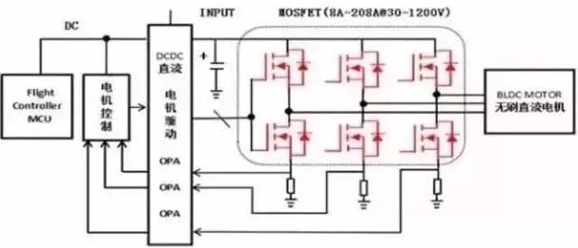 无刷电调,输入的是直流电,通过一个滤波电容稳定电压。然后分成俩两路,一路是电调的BEC使用,BEC是给接收机与电调自身单片机供电使用的,输出至接收机的电源线就是信号线上的红线和黑线,另一路是介入MOS管使用,在这里,电调上电,单片机开始启动,驱动MOS管震动,使电机发出滴滴滴的声音。启动后待命,有些电调带有油门校准功能,在进入待命前会监测油门位置是在高还是低还是中间,高的话进入电调行程校准,中间的话开始发出报警信号,电机会滴滴的响,低的话会进入正常工作状态。一切准备就绪后,电调内的单片机会根据PWM信号线上的信号决定输出电压的大小和频率的高低以及驱动方向和进角多少来驱动电机的转速,转向。这就是无刷电调原理。在驱动电机运转的时候,电调内共有3组MOS管工作,每组2个极,一个控制正极输出,一个控制负极输出,当正极输出时,负极不输出,负极输出时,正极不输出,这样子也就形成了交流电,同样,三组都是这样工作的,它们的频率是8000HZ。讲到这,无刷电调也相当于一个工厂里电机上使用的变频器或者调速器。