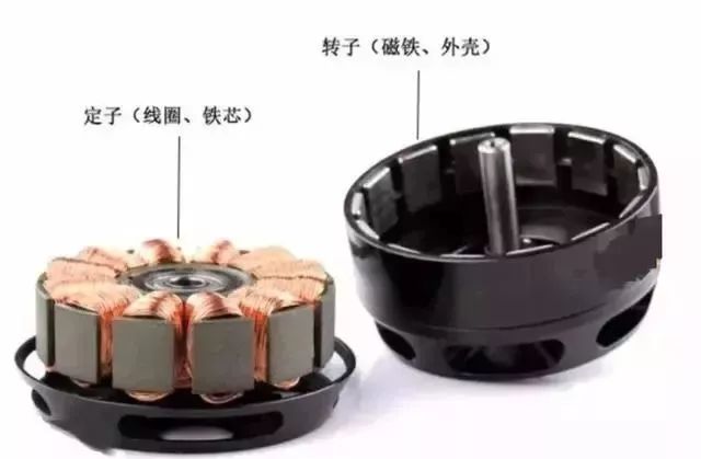 有刷电机的永磁体是固定不动的,线圈绕在转子上,通过一个电刷跟换相器接触间断来改变磁场方向来保持转子持续转动。无刷电机,顾名思义,这种电机是没有所谓的电刷和换相器的,他的转子是永磁体,而线圈是固定不动的,直接接到外部电源,问题就来了,线圈磁场方向怎么改变呢?事实上,无刷电机外部还需要一个电子调速器,这个调速器说白了就是一个电机驱动,它随时都在改变着固定线圈内部电流的方向,保证它跟永磁体之间的作用力是相互排斥,持续转动得以延续。