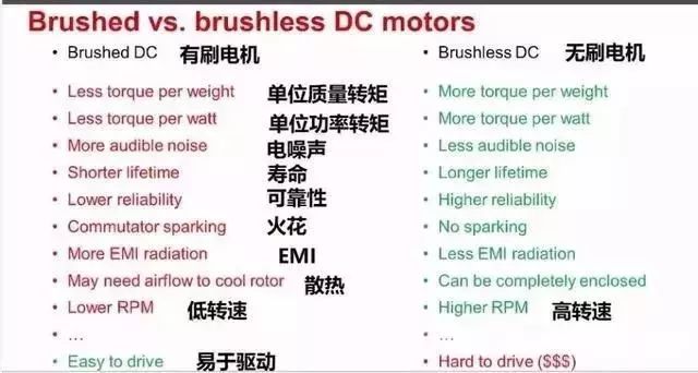 TI的一个介绍视频关于有刷电机与无刷电机的对比,如下图所示,很完整。